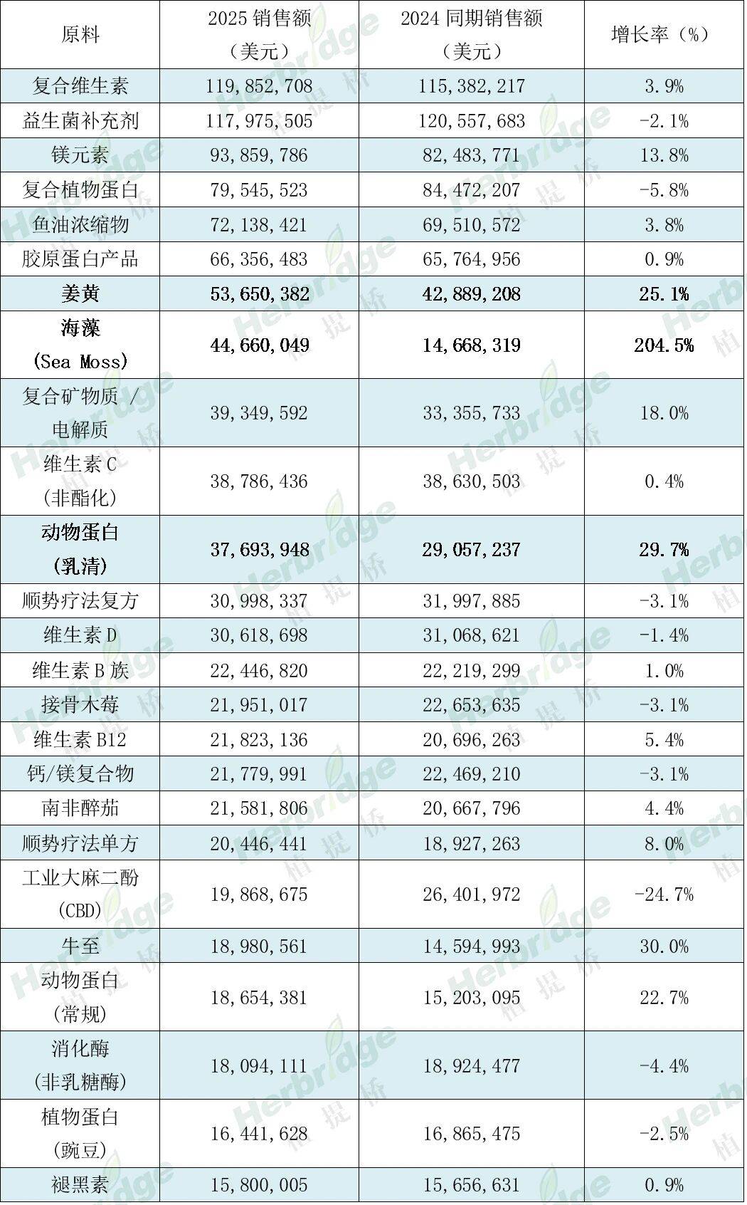 因此,本文将以美国天然强化渠道的数据为主,分析该渠道2025年原料销售数据以及相关的市场趋势。