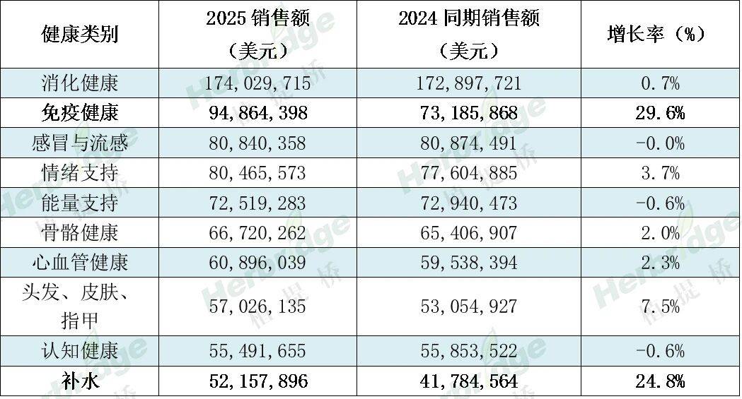 从2025年天然强化渠道销售数据来看,消化健康凭借销售体量依旧占据最大盘,但市场增速几乎停滞(0.7%)。相比之下,2024年补水和免疫健康赛道增长明显,同期年增长率分别是24.8%和29.6%,具体数据如下。