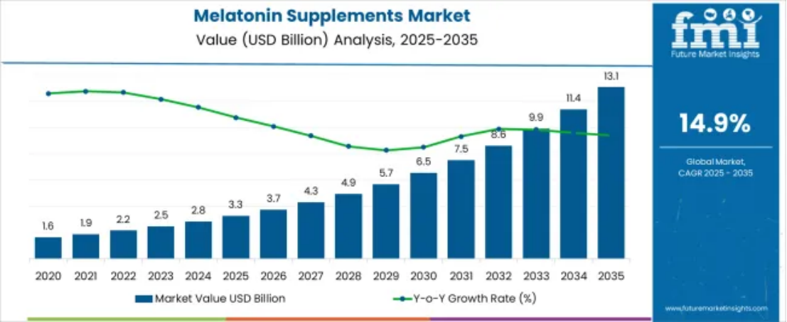 近期据外媒报道,根据Future Market Insights (FMI) 发布的【褪黑素补充剂市场规模及未来市场预测展望(2025-2035年)】报告显示,全球褪黑素补充剂市场正在进入一个决定性的“规模化”阶段,市场价值预计将从2025年的33亿美元增长到2035年的131亿美元,期间年均复合增长率为14.9%。这主要得益于消费者健康观念转向预防以及保健食品、非药健康食品选择的健康理念。此外,失眠管理和压力等细分的健康市场与需求也推动了整个市场的增长。