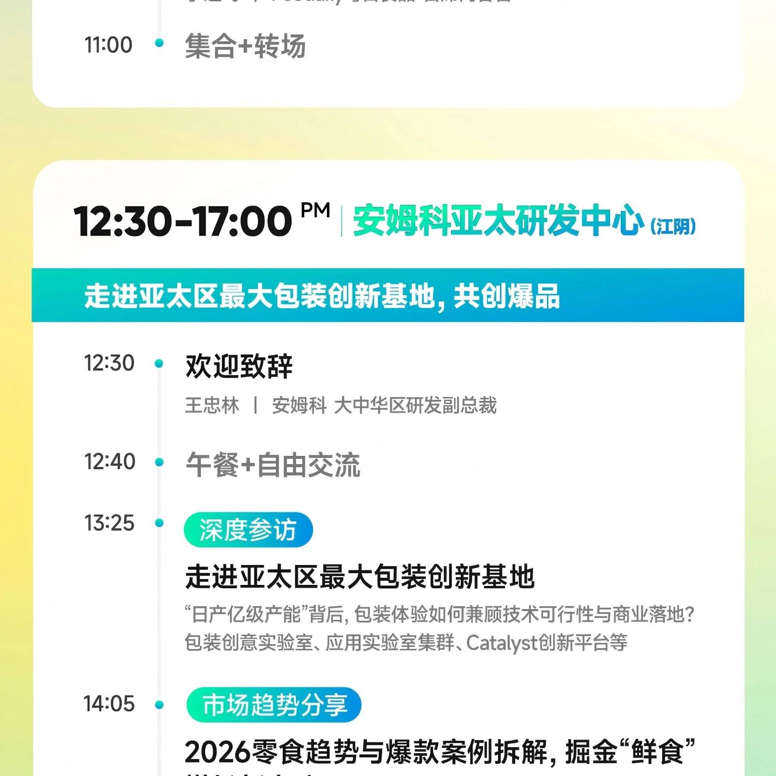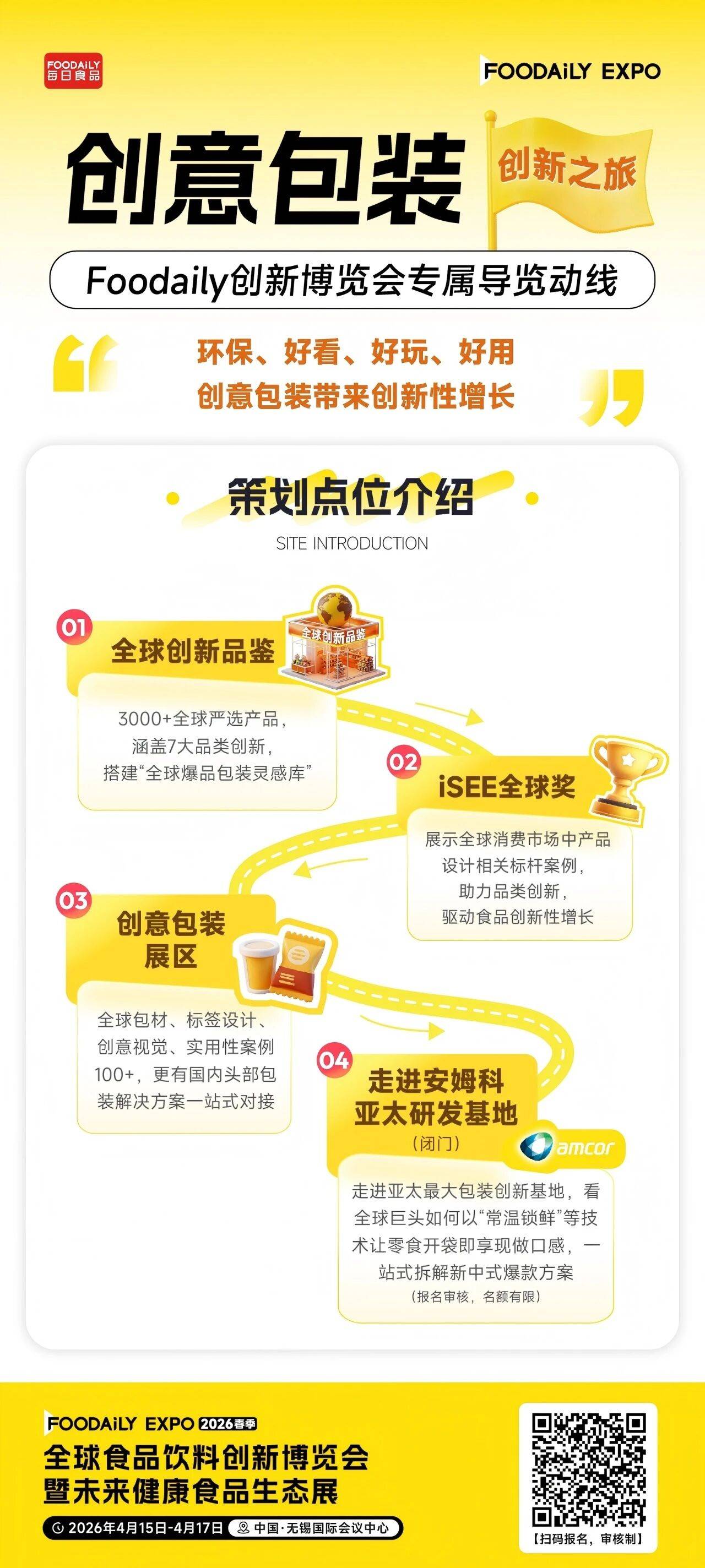 4月16日,我们将以Foodaily创新博览会为起点,从全球视野出发,捕获前沿创新灵感;再走进亚太区最大包装创新基地——安姆科亚太研发中心,探秘包装技术如何赋能原型落地,加速概念共创。让健康零食的创新想法从“脑洞”变为“可落地的方案”,共同解码健康零食的爆款底层逻辑!