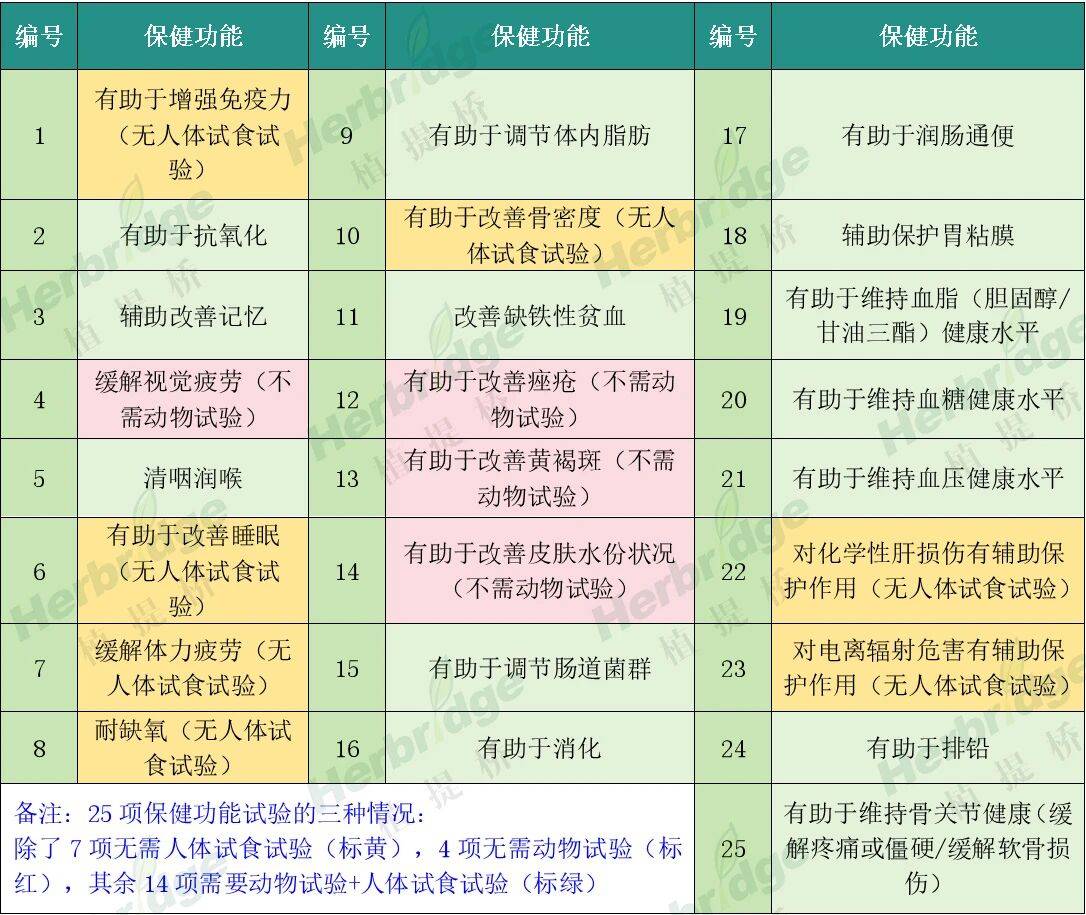 植提桥统计保健食品目前合规的25项保健功能声称,如下表:
