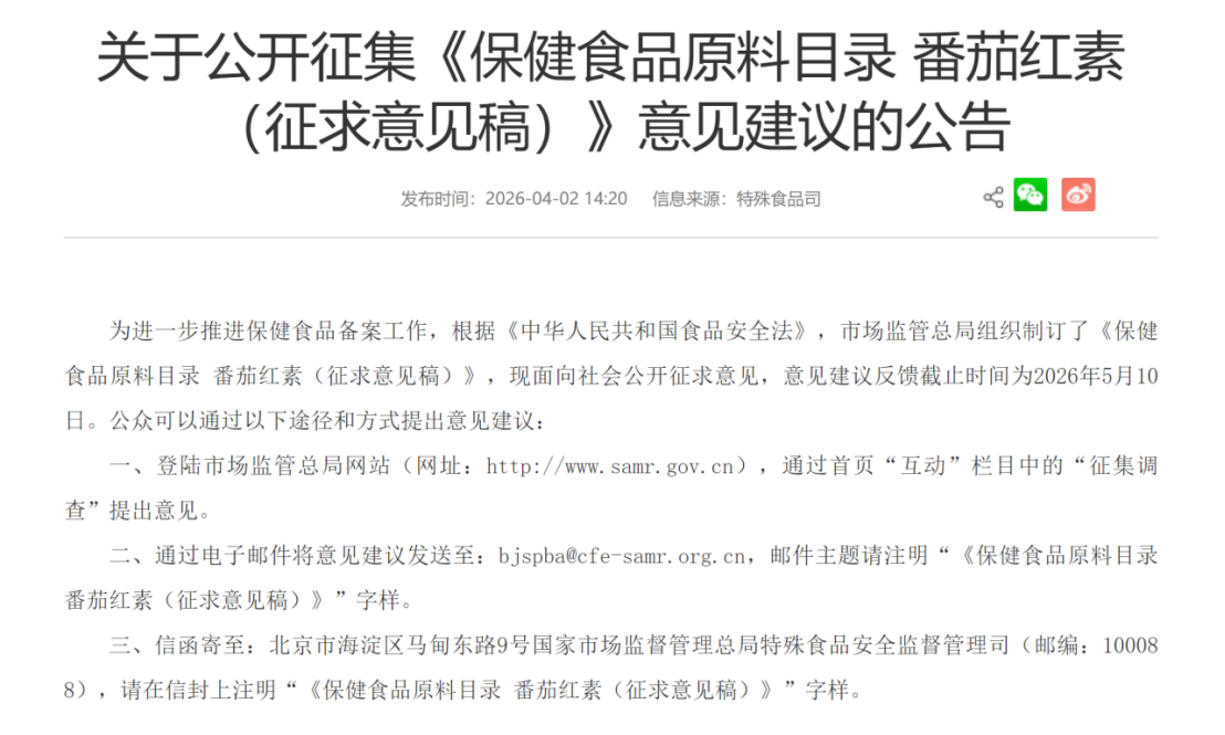 4月2日,国家市场监管总局发布《保健食品原料目录番茄红素(征求意见稿)》,面向全社会公开征集意见,意见截止至2026年5月10日国家市场监督管理总局。
