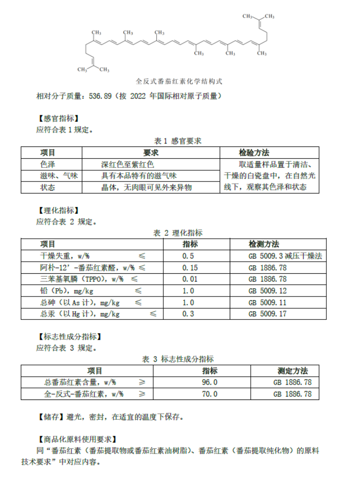 参考标准《食品安全国家标准食品添加剂番茄红素(合成)》(GB 1886.78-2016)或《食品安全国家标准食品添加剂番茄红》(GB 28316-2012),同时满足其标志性成分要求和技术要求。
