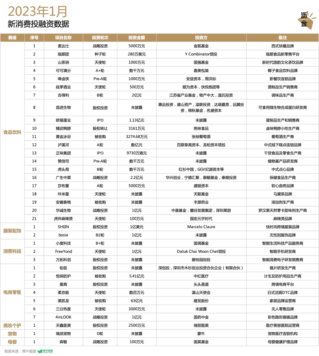 在融资事件数量上,相比12月份的70起,1月份消费领域环比下降48.6%;在总融资金额上,相较12月份的183.01亿元,1月份消费领域下跌幅度为46.94%,仅为97.11亿元。