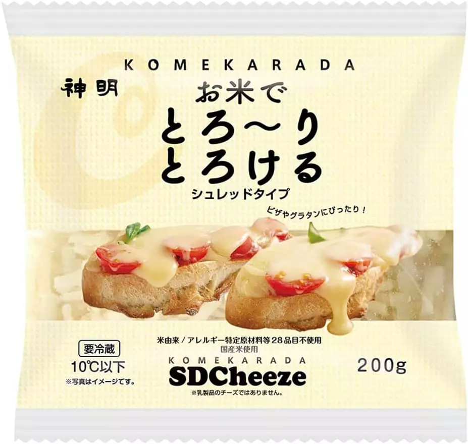 1950年,神明集团的前身“神户制米株式会社”成立。创立60余载,神明始终走在大米深加工领域的前列。近年来,由于农业政策的变化、老龄化加剧等,人均大米消费量持续下降。感受到大米行业的危机,神明集团希望开发出满足更广泛需求的食用方法,增加国产大米的价值,振兴日本农业。秉持这种民族使命感和社会责任感,神明集团最大限度发挥自己在大米上的专业优势,耗时三年研发出世界上第一款以大米为主要成分、不使用任何乳基成分或过敏原的“大米素食奶酪”——SDCheeze。大米蛋白在大米的干物质质量中仅占6%,加热时可以很好地拉伸并融化,完美还原奶酪的质感。