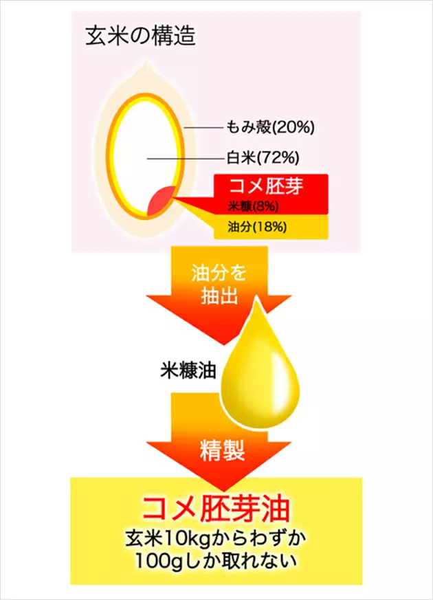 米糠油源自糙米经碾磨后产生的米糠。米糠属于糙米的表层和胚芽部分,含油量20%。其中含有精米所没有的丰富天然维生素和矿物质,特别是油酸 (Omega 9 脂肪酸)、亚油酸 (Omega 6 脂肪酸)、生育酚、生育三烯酚、γ-谷维素和植物甾醇。其中,生育酚和生育三烯酚的强大抗氧化能力使得米糠油具有高度稳定性。而γ-谷维素作为米糠油中特有的营养成分,占大米胚芽油所含成分总量的0.2~0.5%,具有很强的抗氧化作用,改善体内血液循环,对女性非常友好。高水平的油酸 、亚油酸、γ-谷维素使得米糠油成为降低坏 (LDL) 胆固醇水平最有效的植物油。
