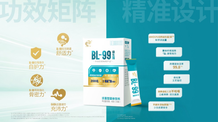 其核心成分乳双歧杆菌BL-99是从中国健康婴儿肠道10万亿菌群中选拔出来的特种菌,有五大核心专利支持,通过了近400人大规模国人人体临床研究证实有助于调节肠道微环境。每条单品中添加了200亿活性益生菌,即使通过胃部存活率仍高达98.8%,可顺利到达肠道发挥作用。除此之外,伊利健康科学BL-99还将水分活度控制在0.15以下,进一步保证其在货架期内的高活性,能够多维度促进益生菌发挥作用。