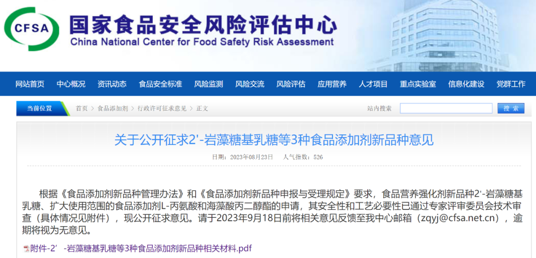 2023年8月23日,国家食品安全风险评估中心对2'-岩藻糖基乳糖(2'-FL)再次征求意见。