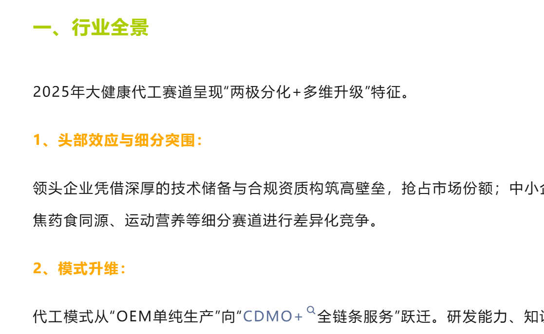 头部代工企业不再满足于单纯的生产制造,而是通过资本化运作、技术迭代、跨境布局与标准共建,打破传统代工边界,向“研发+生产+服务”一体化的科技服务商转型。它们正以前所未有的深度,重塑着大健康产业的竞争生态。一、行业全景2025年大健康代工赛道呈现“两极分化+多维升级”特征。1、头部效应与细分突围:领头企业凭借深厚的技术储备与合规资质构筑高壁垒,抢占市场份额;中小企业则依托研发优势,聚焦药食同源、运动营养等细分赛道进行差异化竞争。2、模式升维:代工模式从“OEM单纯生产”向“CDMO+全链条服务”跃迁。研发能力、知识产权(IP)以及国际合规性已成为企业的核心生存资本。3、双轮驱动:全球化布局与本土