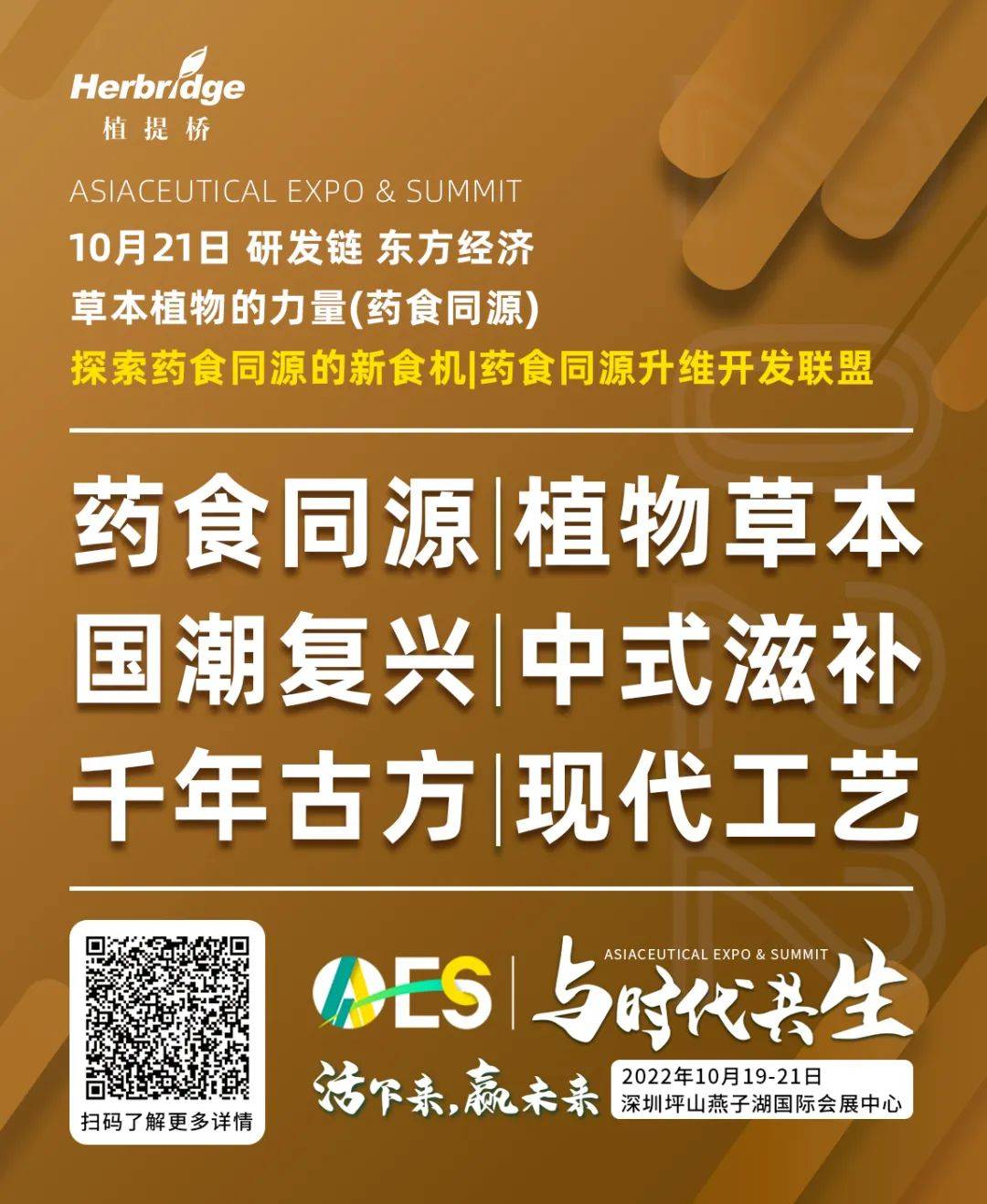 植提桥也正在联合行业内企业,着力助推中式滋补与药食同源的全面发展。在2022年10月19日-21日于广东举办的AAES2022天然健康产品行业大会中,研发链板块——东方经济、草本植物的力量(药食同源)和营销链板块都将邀请行业大咖探索药食同源的新食机和中式滋补与新消费的融合。