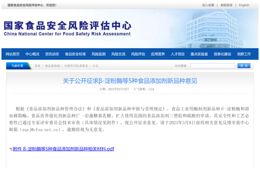 2月10日,国家食品安全风险评估中心公布对食品工业用酶制剂新品种β-淀粉酶和溶血磷脂酶、食品营养强化剂新品种2'-岩藻糖基乳糖、扩大使用范围的食品添加剂三赞胶和硫酸的申请征求意见,截止时间为2023年3月8日,逾期将视为无意见。
