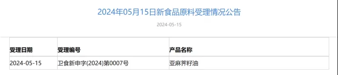 5月15日,国家卫健委受理了一款新食品原料的申报—— 亚麻荠籽油。