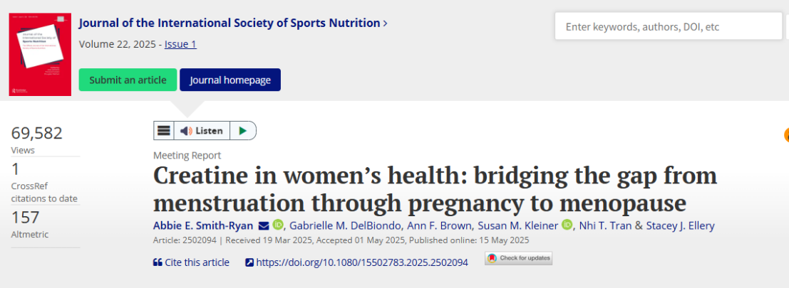 2025年,发表于《国际运动营养学会杂志》(JISSN)的研究,整合了肌酸在女性从经期、孕期到更年期不同生理阶段的潜在作用与安全性。这一研究为肌酸在女性群体中应用的打开了新视角。