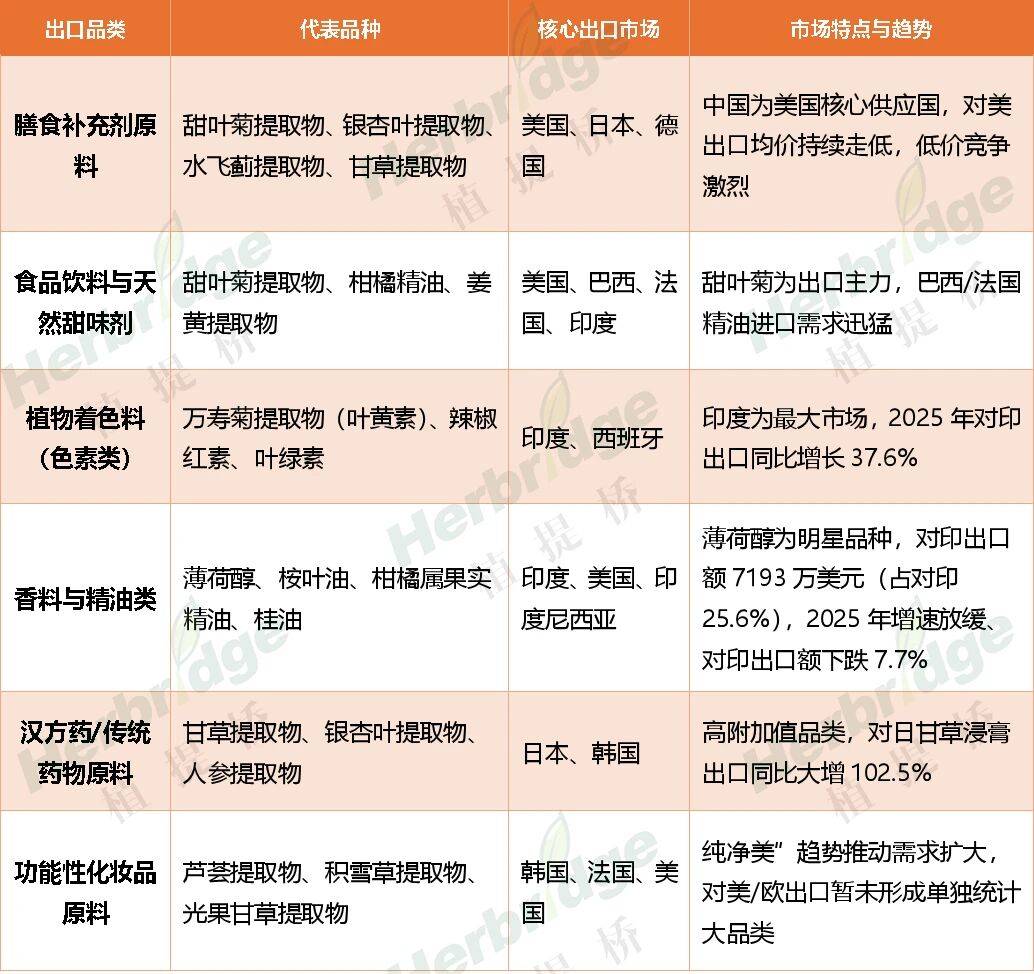 2025年中国植物提取物出口仍由大宗品种主导,但产品结构持续优化,传统明星品种增速放缓、高价值品种稳固增长、新兴品种异军突起,产品驱动力从“单一品种规模增长”转向“场景应用创新驱动”,核心出口品类可分为几大类: