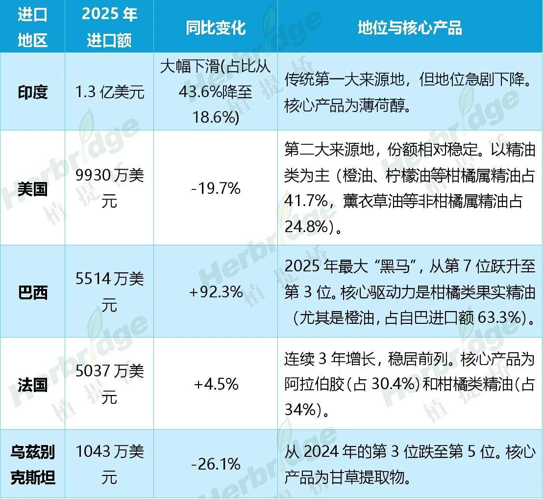 大宗原料进口萎缩:自印度进口的薄荷醇、自乌兹别克斯坦进口的甘草提取物等传统大宗品种进口额显著下滑,表明国内相关产业替代能力增强或需求结构已发生转变。