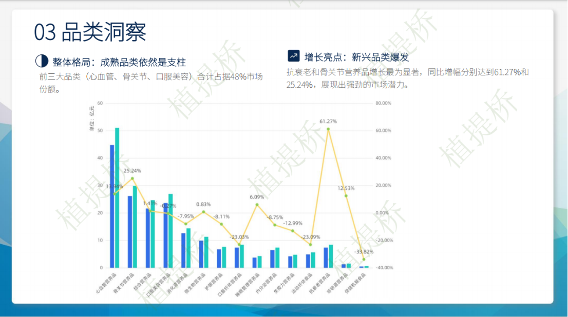 心血管和骨关节等成熟品类依然是市场支柱,而抗衰老等新兴品类则展现出巨大的增长潜力。