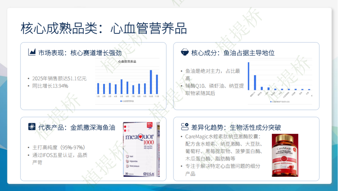 心血管营养品是市场的核心赛道,鱼油类产品占据主导。未来的竞争将更加注重成分的创新和高活性,如水蛭素等成分的应用,为品牌提供了差异化的机会。
