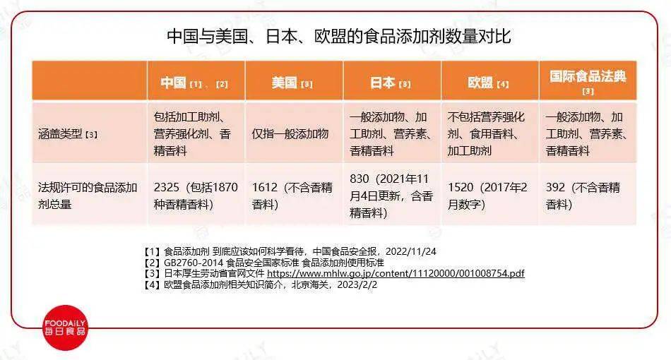 在对全球主要经济体法规体系下食品添加剂数量进行简单对比后我们发现:除去香精香料,中国的食品添加剂总量与日本和国际食品法典(CODEX)基本相当,而明显低于美国和欧盟。