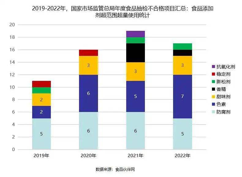 在市场层面,防腐剂领域一直是监管重点。数日前,市场监管总局对外公布了2022年度食品抽检通告及不合格项目的汇总情况。在17个“食品添加剂超范围超限量使用”的项目类型中,防腐剂就占到了5个,仅次于色素(7个)。Foodaily将过去4年的抽检结果汇总如下图。很明显,防腐剂、色素与甜味剂是企业违规使用的三个重点品类。而防腐剂的滥用重点又较多集中在脱氢乙酸及其钠盐、苯甲酸及其钠盐、山梨酸及其钾盐、二氧化硫等适用范围较广的合成防腐剂上。