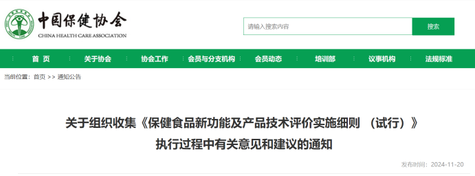2024年11月20日,中国保健协会发布中保函发〔2024〕115号文,再次针对2023年8月13日公布的《保健食品新功能及产品技术评价实施细则(试行)》(以下简称“实施细则”),向社会广泛收集《实施细则》在执行过程中的意见建议,截止日期2024年12月15日前。