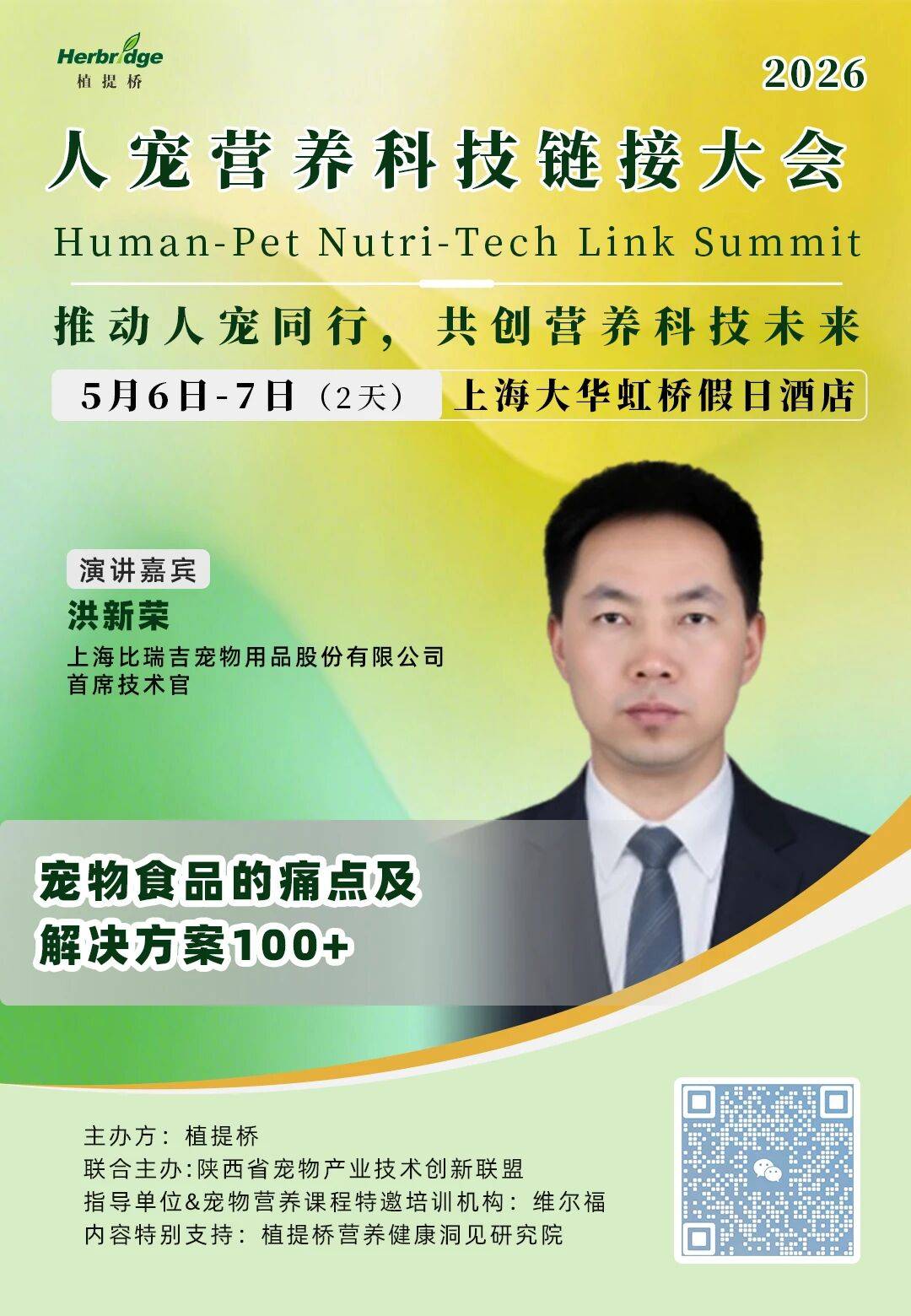 "植提桥摘要:"人宠营养科技链接大会”将于2026年5月6日-7日在上海·大华虹桥假日酒店正式举办,上海比瑞吉宠物用品股份有限公司首席技术官洪新荣将在现场进行分享。"