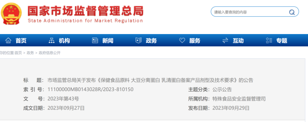 9月29日,国家市场监督管理总局发布,根据《中华人民共和国食品安全法》《保健食品原料目录 大豆分离蛋白》《保健食品原料目录 乳清蛋白》,总局制定了《保健食品原料 大豆分离蛋白 乳清蛋白备案产品剂型及技术要求》,自2023年10月1日起施行。