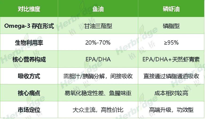 同为宠物Omega-3的核心来源,鱼油和磷虾油在存在形式、吸收机制、营养构成上有着本质区别,这也造就了二者“大众主流”与“高端升级”的不同市场定位,具体差异一目了然。