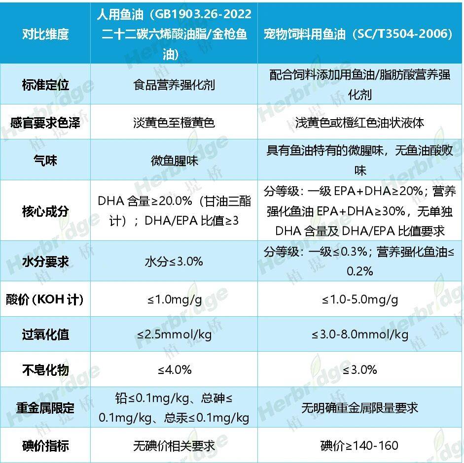 人用与宠物用鱼油、磷虾油并非简单的“剂量差异”,质量标准的差异,同时分属食品/保健食品、宠物饲料两大监管体系,来源、核心标准差异显著。