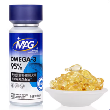 MAG 犬用超浓缩天然鱼油,主打95% Omega-3含量,EPA与DHA配比科学,采用超浓缩提纯工艺,有效降低鱼腥味,提升适口性;采用人用级原料标准,保障宠物食用安全。