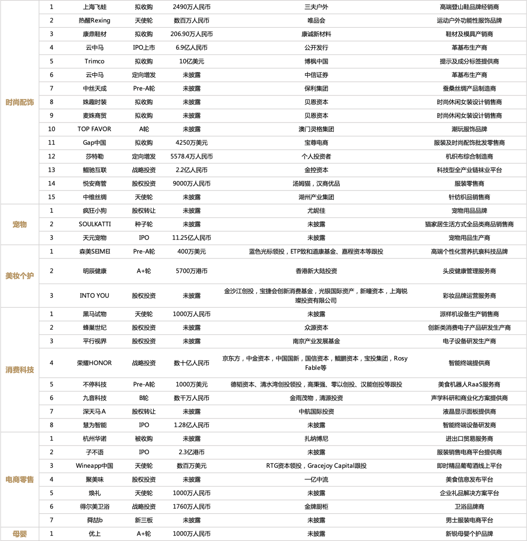 本月共有20起过亿元投融资(含IPO),主要集中在食品饮料与时尚配饰领域。其中服装行业的大额投资在本月尤为密集,除上文提及的来自贝恩资本的两笔收购以外,宝尊电商斥资4250万美元完成了对知名服装及时尚配饰批发零售商「Gap中国」的收购。